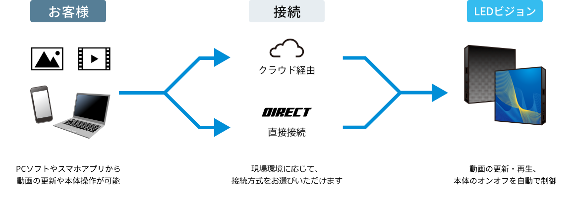 PCソフトやスマホアプリから手軽に動画の更新・操作ができるだけでなく、本体の電源オン・オフまで自動制御が可能です。これにより、スタッフの手を煩わせることなく、常に鮮度の高い情報を発信し続けることができます。