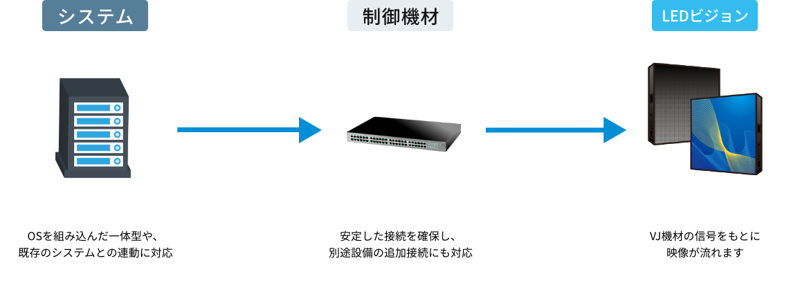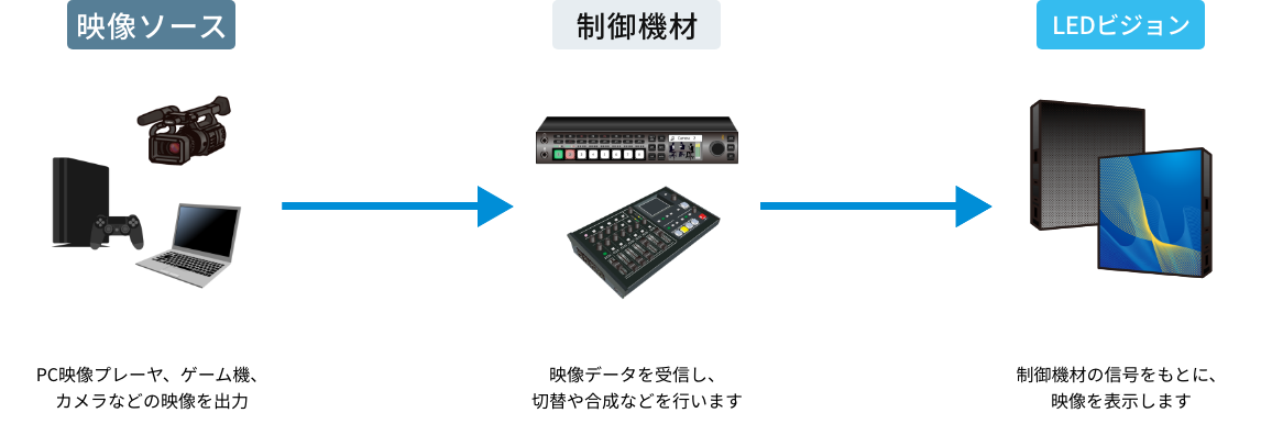 専用の制御機材が映像データを受信し、シームレスな切り替えや合成処理を行います 。この制御機材からの正確な信号が、大型画面に迫力ある映像を映し出す鍵となります。