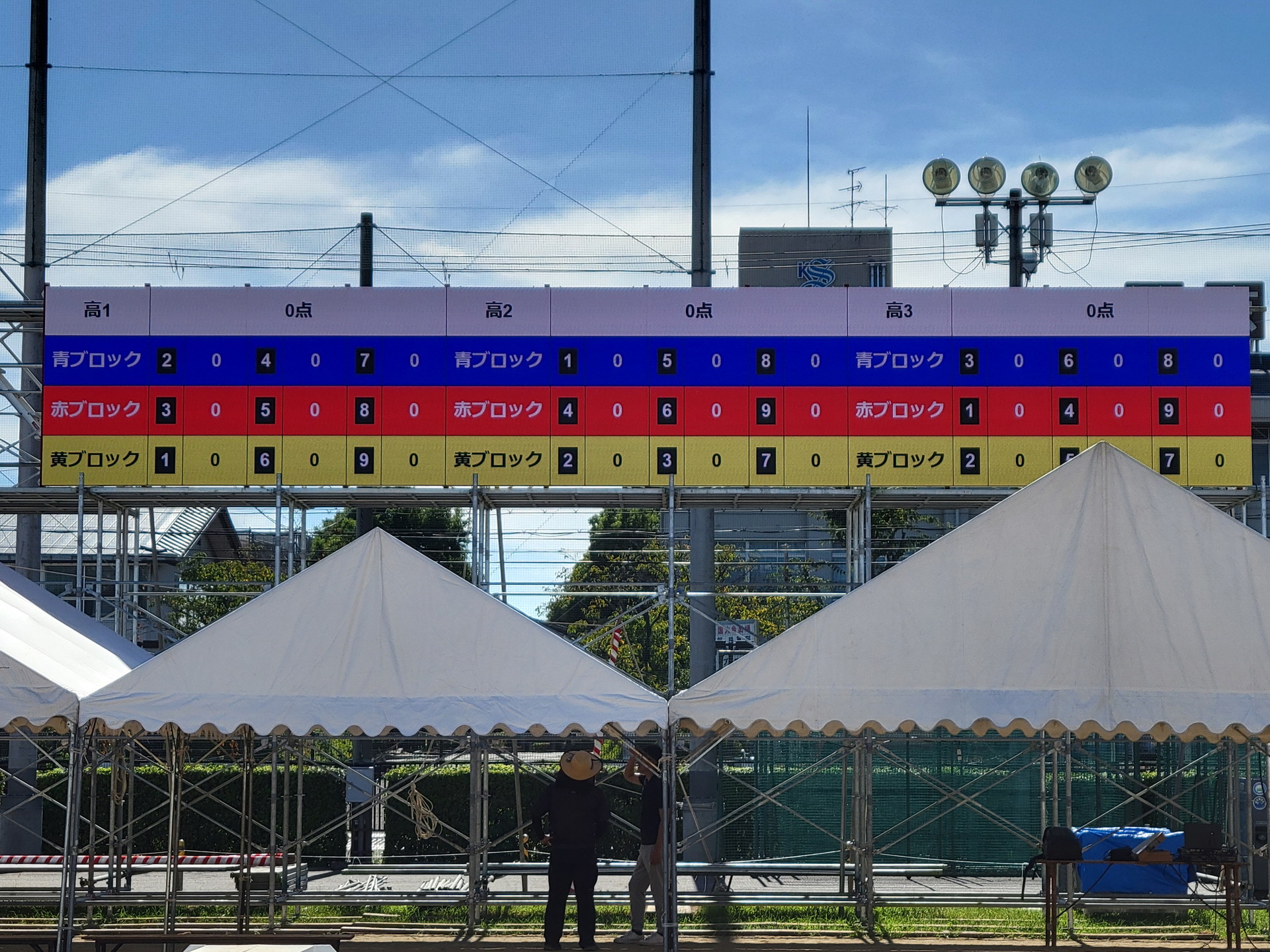 以前まではマグネット式の得点板を使用されており、生徒さんが更新されていました。安全性や効率性の向上、デジタルに触れていただくことを目的にレンタルで弊社製品を導入いただくことになりました。得点板システムの制作も承りました。レイアウトや必要な機能のヒアリング、事前のレクチャーにもご協力いただき、当日は問題なく運用できました。オペレーションは全て生徒さんが行っています。これまではスピーカーアナウンスでしか、集合案内ができませんでしたが、今回から視覚的にも案内をかけることができるようになりました。もちろん一般的なスタジアムの大型ビジョンのように、映像や画像コンテンツも表示できます。